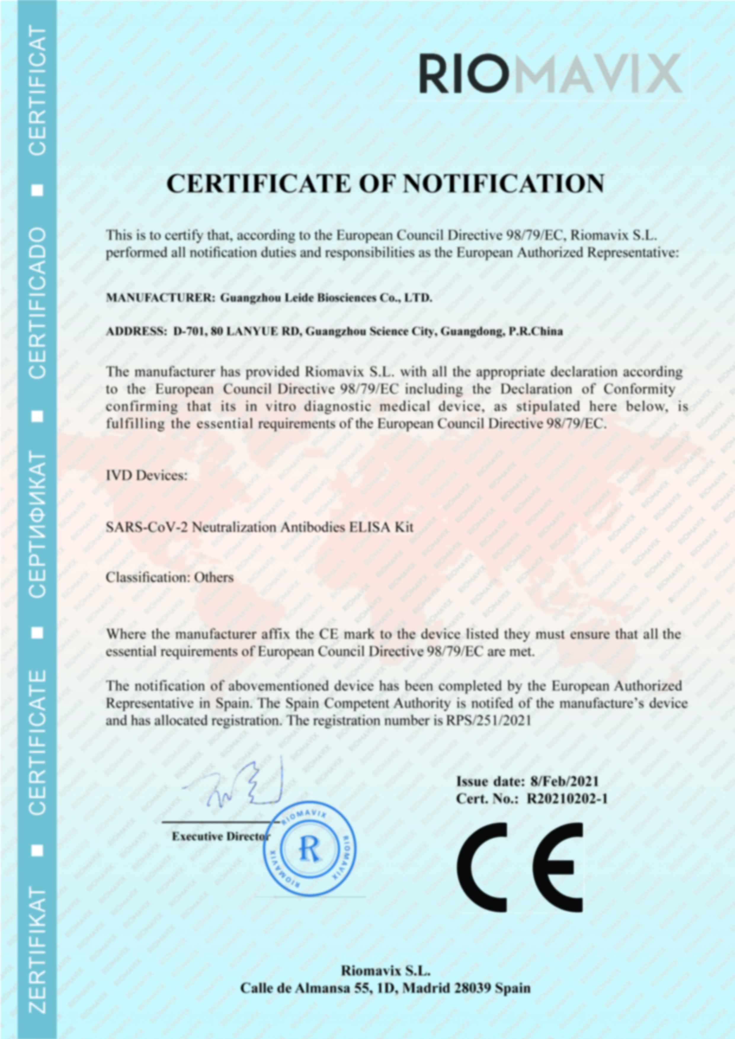 近日,由廣州市雷德生物科技有限公司(簡稱“雷德倍爾”)自主研發的新型冠狀病毒(2019-nCov)特異性細胞免疫反應檢測試劑盒以及新型冠狀病毒(2019-nCov)中和抗體檢測試劑盒(ELISA),于2021年2月8日獲得CE認證。