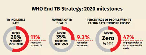 2014年和2015年世界衛生組織和聯合國提出可持續發展目標,希望2035年能夠終止結核病的流行,2020是作為里程碑的一年,結核防治結果卻遠遠未達到預期。與2015年相比,2020年結核病發病率目標是降低20%,目前只降低了11%;結核病的死亡人數是降低35%,目前只降低了9.2%;由于結核病治療導致家庭經濟面對巨大困難的百分比降至0%,目前只達到47%。