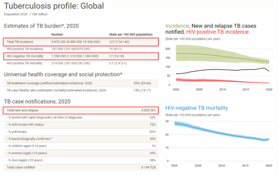 從數據來看,2020年,WHO預估全球結核病新發病例為987萬(發病率為127/10萬),因結核病死亡(艾滋病陰性患者)的人數為128萬(死亡率為17/10)。