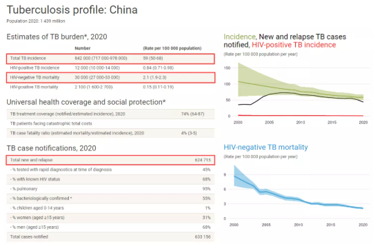 中國結核病新發病例為84.2萬,因結核病死亡(艾滋病陰性患者)的人數為3萬(死亡率為2.7/10)。