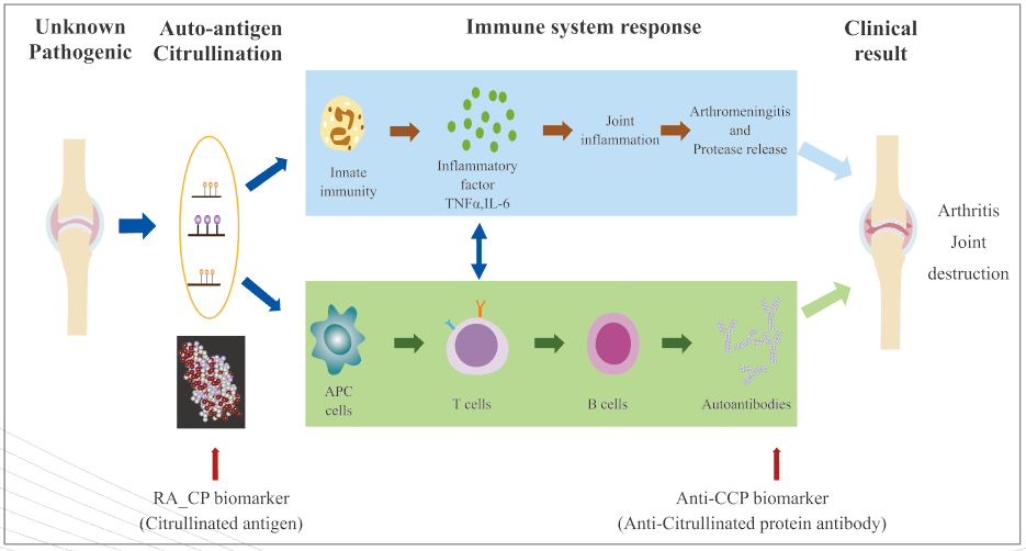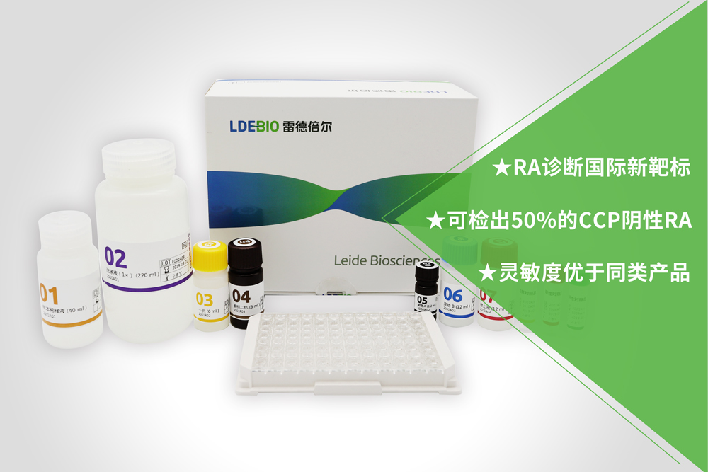 從2000年以來,除了國際公認的RA診斷指南中CCP外,一直未有突破性的高靈敏指標(biāo)。我公司研發(fā)出最具潛力的RA血清學(xué)診斷新指標(biāo)——RA_CP(類風(fēng)濕關(guān)節(jié)炎瓜氨酸化蛋白檢測試劑盒),采用雙抗體夾心法測定人血清中瓜氨酸化類風(fēng)濕抗原,這是根據(jù)抗原-抗體的出現(xiàn)時間先后,疾病發(fā)生原理設(shè)計和臨床大量樣本驗證了的一個檢測類風(fēng)濕關(guān)節(jié)炎疾病的新指標(biāo)。RA_CP對RA的檢測靈敏度85%-95%,特異性85%-95%,對于常規(guī)CCP檢測陰性的RA患者,RA_CP仍可檢出40%-50%(截至目前的數(shù)據(jù)是超過50%)。在CCP陰性患者中使用RA_CP可提高RA患者檢出率,提高臨床診斷類風(fēng)濕性關(guān)節(jié)炎的準確性,顯著降低臨床漏診發(fā)生率,開展RA_CP檢測項目在臨床上可以更好地輔助RA診斷。
